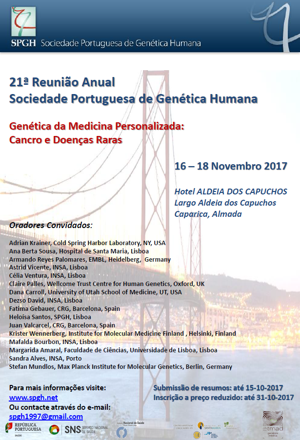 It is our great pleasure to welcome you to the 21st Annual Meeting of the Portuguese Society of Human Genetics (SPGH), in Lisbon. We are immensely grateful to all our sponsors for making this meeting possible again, and to all the members of the Local Organizing Committee and the Scientific Committee, whom we wish to address a special acknowledgement. In a moment when Personalized Medicine is an emerging approach for disease diagnosis, treatment and prevention, providing extraordinary opportunities to improve public health, the SPGH Organizing Committee and the Scientific Committee made their best effort to organize an appealing program with lectures delivered by leading national and international scientists, who will present exceptional findings in the Human Genetics of Personalized Medicine field. We are looking forward to listening to our outstanding invited senior lecturers, as well as the young researchers who will present their works that have been selected among the submitted abstracts—a highly stimulating and exciting meeting, we presume. We received a remarkable number of abstract submissions, which demonstrates how important Human Genetics has become, nowadays.